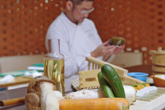 All of the participants look so serious, standing on the around of the chef’s professional table.